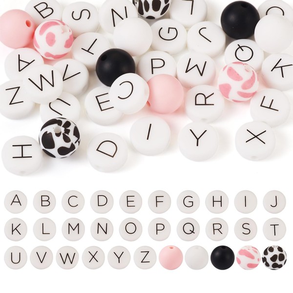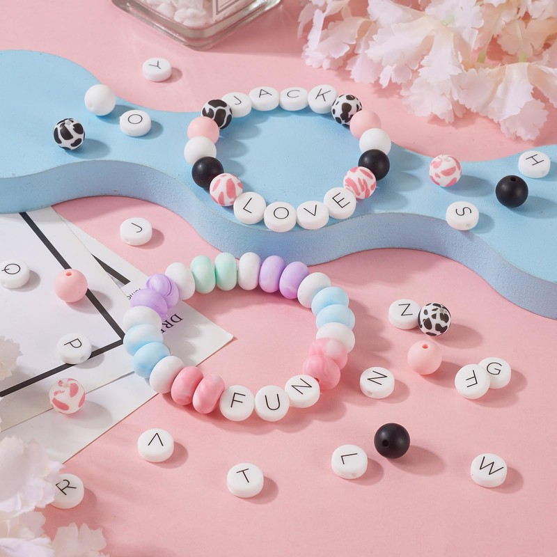 FASHEWELRY 36Pcs Silicone Letters Beads Round Alphabet A-Z Silicone Beads Cow Rubber Focal Beads for Bracelet Necklace Keychains Jewelry Making