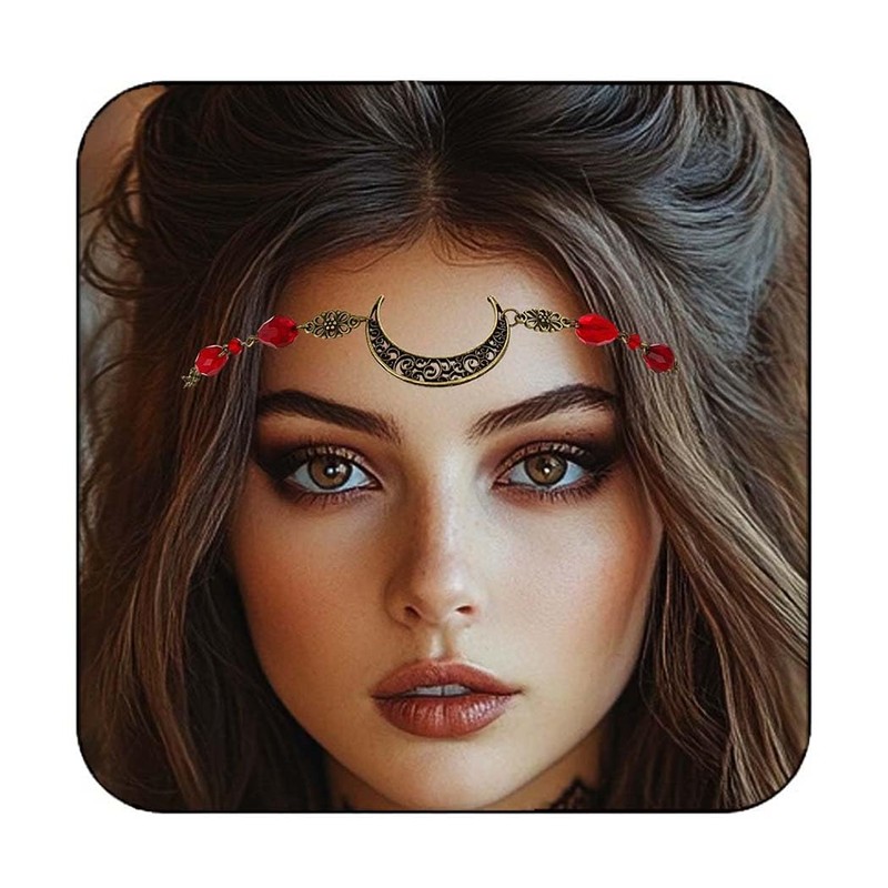 Fashey Moon Head Chain Rhinestone Hair Chain Gold Headpiece Gypsy Head Jewelry for Women (Red)