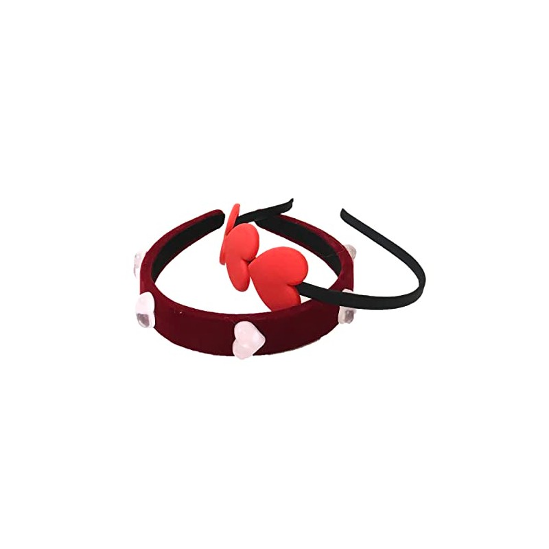 - Express your personality with two distinct looks. One headband features bold, playful red hearts, while the other boasts a luxurious velvet texture adorned with delicate pink heart accents.