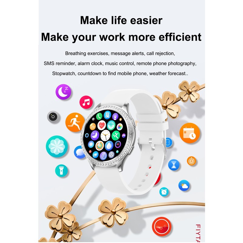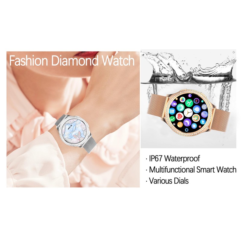 - 【💕Upgraded Fashionable Smart Watch for Women💕】Smart watches inlaid with diamonds are more high-end and make the wearer more elegant.Designed with IP67 waterproof smart watch with beautiful design, circular display and full touch 1.32 inch color screen, 360*360 pixel resolution makes the screen clear and bright. The case of the Bluetooth smart watch is made of metal. The smart watch has a silver strap and a bonus silicone pink strap as alternatives for your multi-wear life occasion.🎁