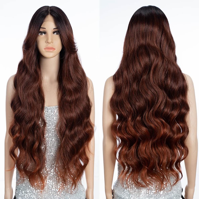 FASHION IDOL Big Wavy Lace Front Wig with Curtain Bangs 36 Inches Long Dazzling Heat Resisatnt Synthetic Hair Body Wavy Wig Middle Part