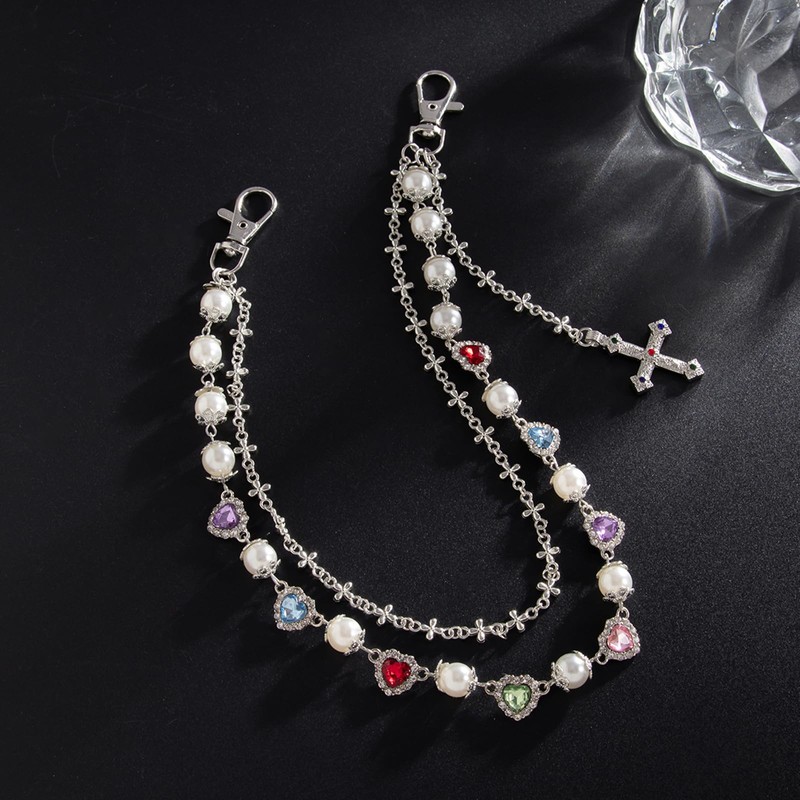 Fashion Layered Pants Wallet Chains - Exquisite Gold Silver Rhinestone Flower Pearl Jean Pocket Chain for Women Men Cute Bag Purse Charms Jewelry (silver link heart)