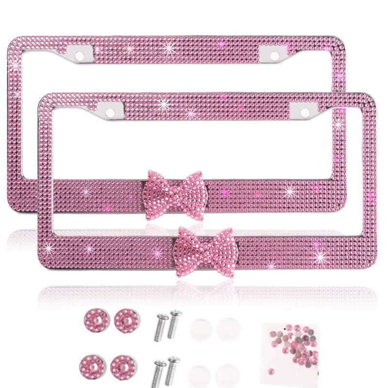 Fashion Premium Pink Bowknot Design Crystal License Plate Frames,Waterproof Bling License Plate Cover,US Universal Rhinestone Plate Cover for Women(2 Frames)