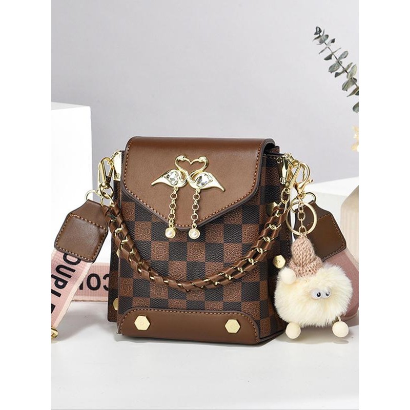 Fashionable Geometric Pattern Pu Leather Crossbody Bag As Gifts, 2025 New Versatile Shoulder Bags 2025 for Women, Trendy All-match Bag Charm Chain Flap Affordable Luxury Bag:_Dark coffee_one-size