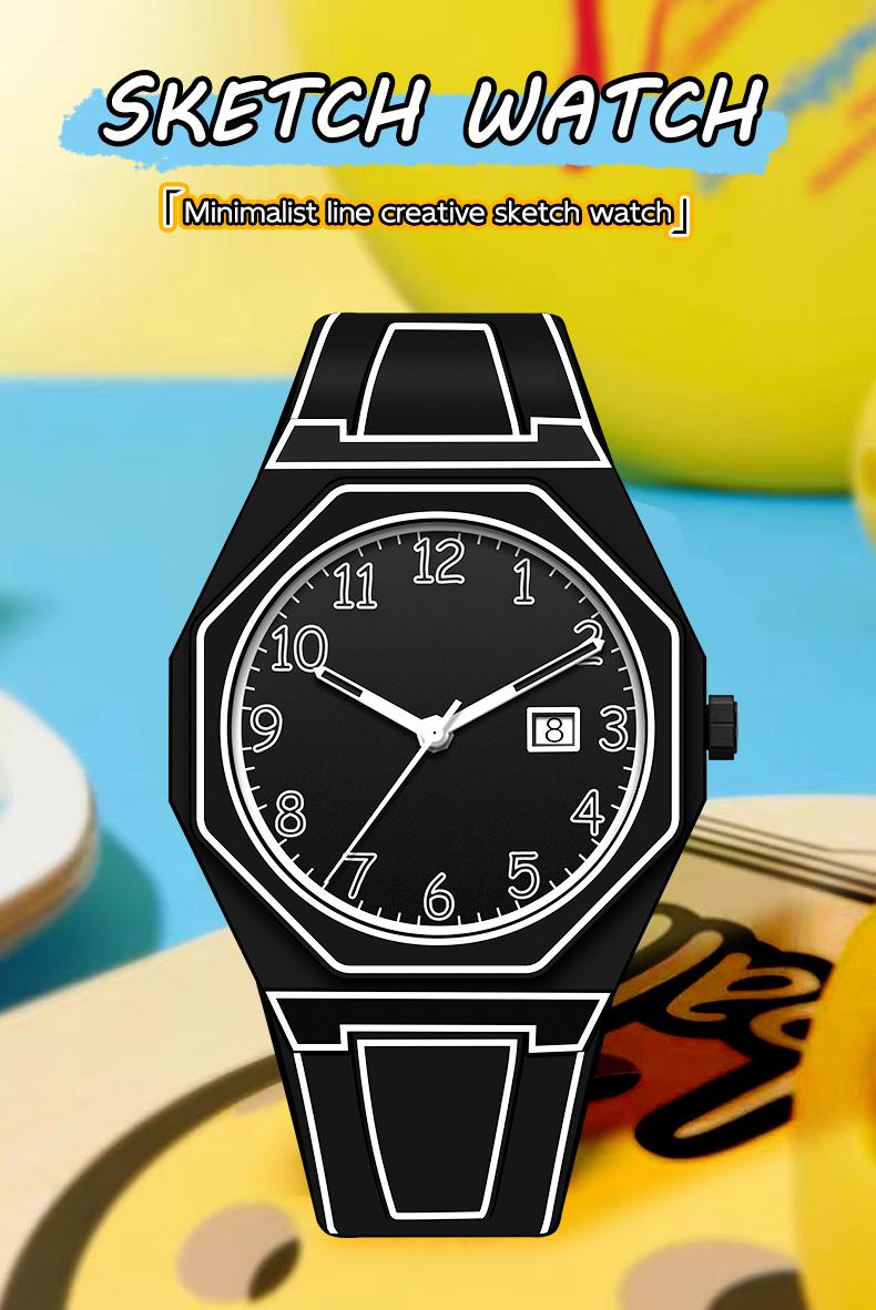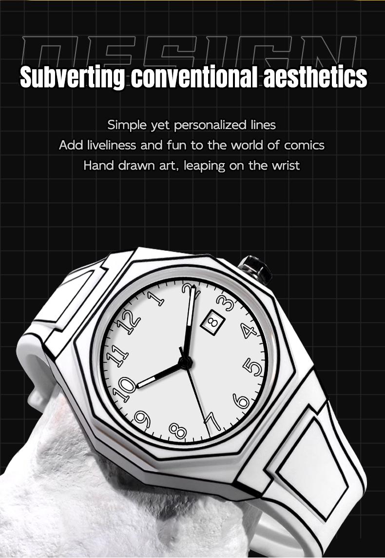 Fashionable Men's Watch, 3D Sketch Art Design with calendar,Silicone Case & Band, Analog Display, Battery-Operated Modern Creative Leisure - Color: White