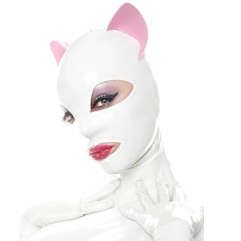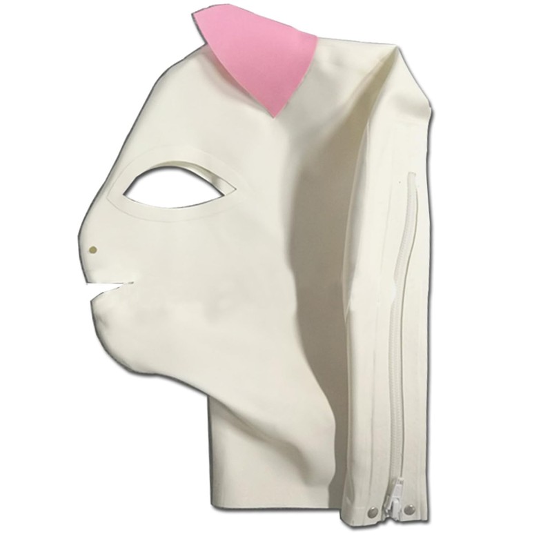 Fashionable White Latex Cat Ears Hooded Mask, Natural Rubber Latex Hooded Mask, with Back Zip, M