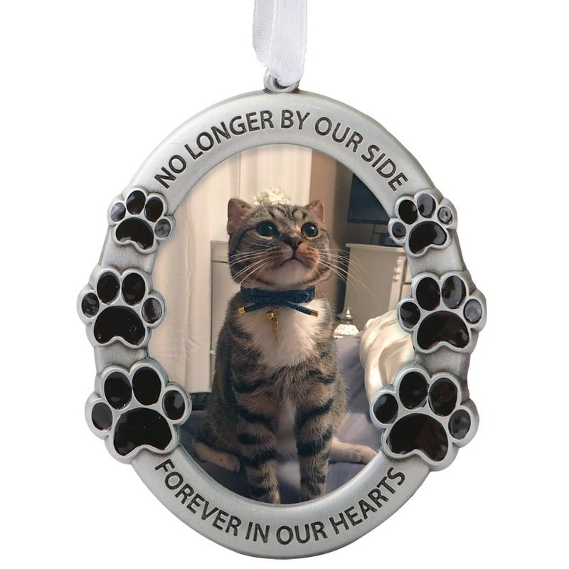 - PET MEMORIAL ORNAMENT. This little photo frame is made to remember our departed beloved pets. designed with beautiful black paw prints and words, "No Longer By Our Side" and "Forever In Our Hearts", nicely colored with pewter gray. Remember his/her contagious big smile that made you smile too through a photo.