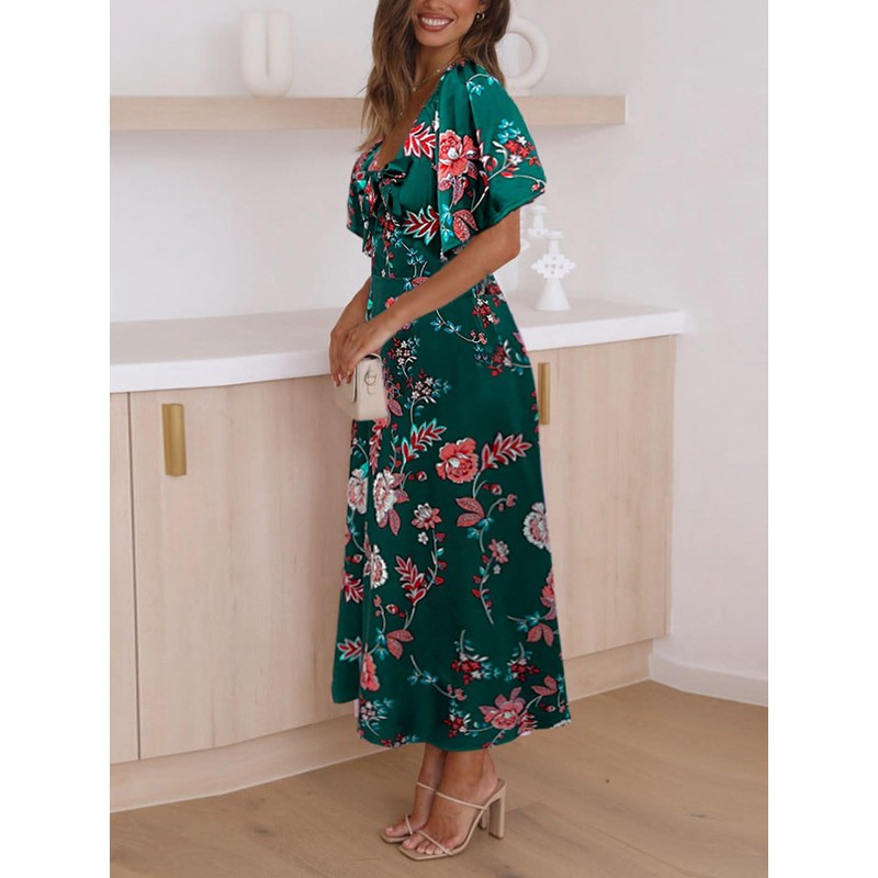 Fashionme Womens Dresses 2024 Maxi Dresses Deep V Neck Elegant Bow Tie Front Short Sleeve Summer Casual Floral Satin Sun Dress Wedding Guest Graduation Vacation Beach Tea Party Dark Green
