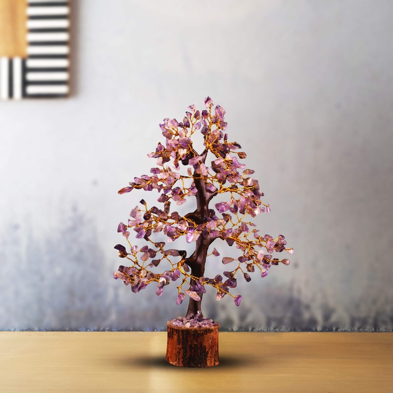 - 🌳This Beautiful Amethyst Natural Gemstone Tree (Golden Wire) Handmade In India. Size approx 10-12 Inches in height (when open up the leaves of the tree). Wooden base is approximately 2.5-3.5 Inch Total Weight range is 315 to 360 grams app. This Money tree brings luck, prosperity, provides protection against any kind of losses, and enhances the power of an individual. Great decorative statue to put in office, front door, and living room.