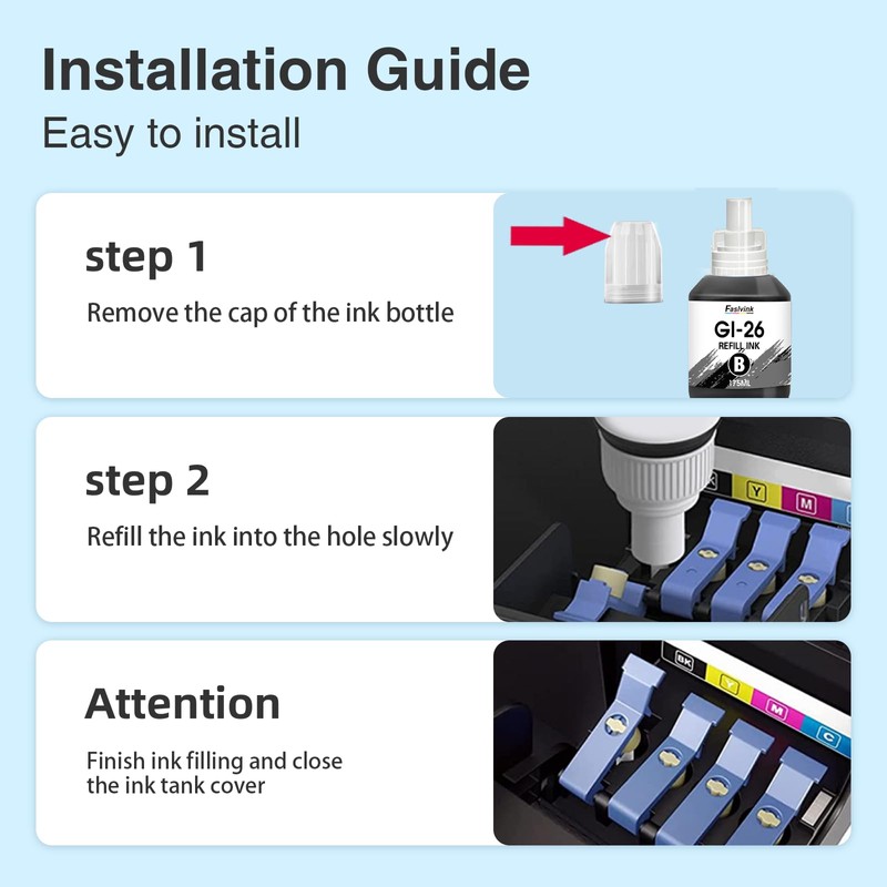 - 【Warm Note】:Please confirm whether your printer model is suitable for gi-26 ink bottles before purchasing. Please clean the ink tank and the print head before using these ink bottle refill to reach a better printed effect. Since the dye ink and pigment ink can not be mixed, please check carefully before install the refill ink.