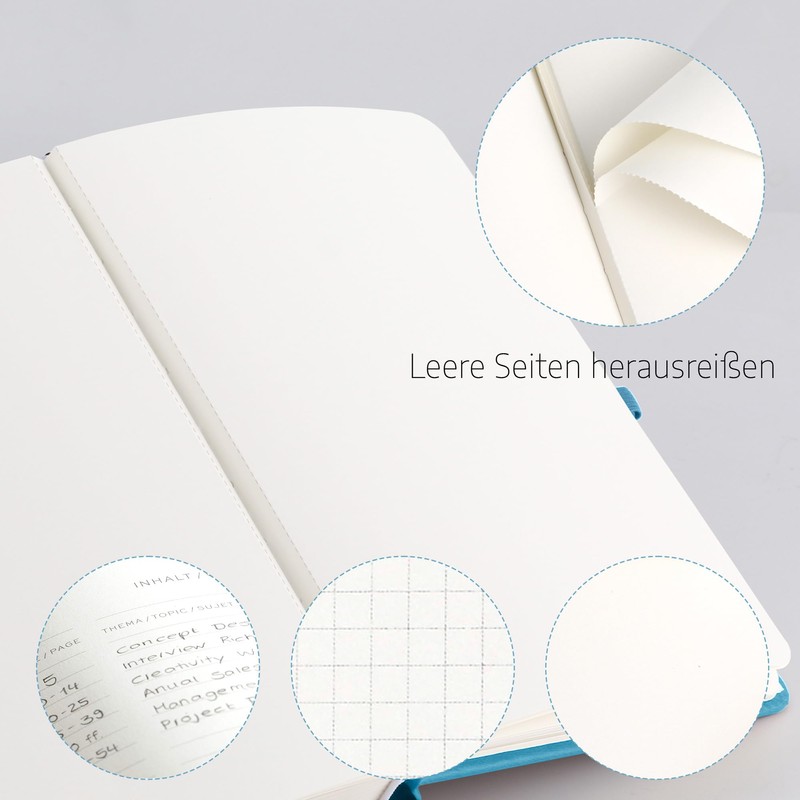 Discover the incomparable quality of the Fasood notebook A5 squared - the perfect writing instrument for discerning users. The advanced classic journal notebooks in A5 format (14.5 x 21 cm) offers enough space for your creative writing needs. With proud 320 pages of thick paper, this notebook is not only a writing tool, but your reliable companion for recording lectures and various different notes about a whole year or more. The 100 g/m² acid-free paper is not only thicker, but also suitable for most pens without smudging. The high-quality vegan leather case and exquisite binding design make this A5 notebook particularly durable and appealing. The possibility to remove 64 pages, offers you maximum flexibility in organising your notes. Each notebook contains 2 bookmark bands, 1 elastic closure, 1 pen loop, 1 back pocket and 2 index adhesive labels for optimal use. With the Fasood notebook squared you will not only receive a writing instrument, but also a thoughtful accessory that takes your writing experience to a new level.