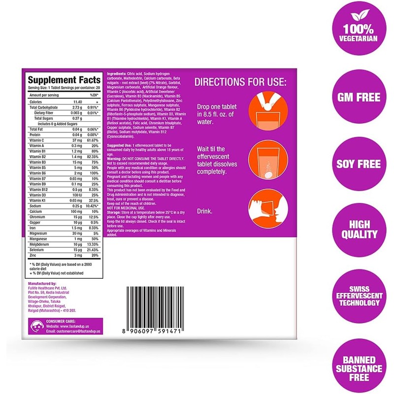 - FastandUp Multivitamin Complete Multivitamin Supplement All Day Energy Saver Multipack 80 Effervescent Tablets 4 X 20 Supports Immune System Orange Flavour