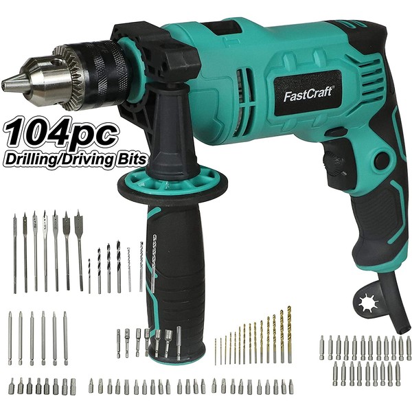 FastCraft Impact Drill Driver + 104pc Bits - New Impact Drill Driver 9.0A PEAK POWER 1/2-inch Chuck 0-2800RPM Dual Switch Electric Impact Drill, 360° Rotating Handle - Drill Driver