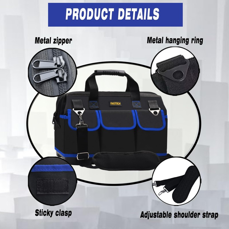 FASTECH 20 Inch Tool Bag, Waterproof Wide Mouth Tool Kit, Heavy Duty Tool Bag Organizer With Shoulder Straps and Molded Base, Tool Storage Package For Screwdrivers, Pliers, Nut Drivers (Blue20IN)