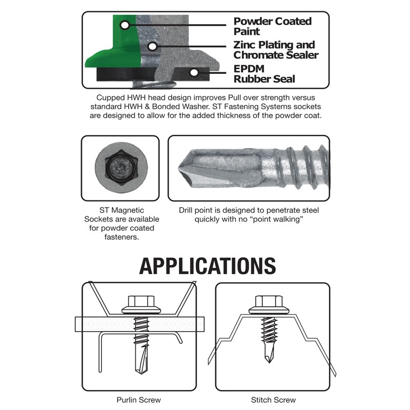 - [EPDM RUBBER WASHER] Cupped head encapsulates to provide a secure seal even when driven at an angle