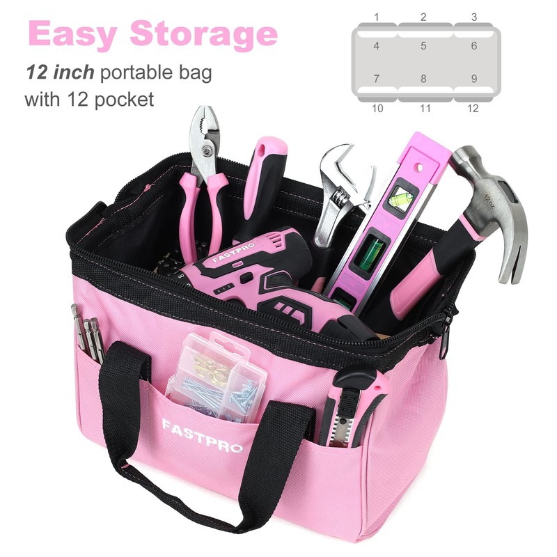 - The pink tool set included 12inch tool bag for easy storage. It is constructed by 600D polyester fabric for durability, wide-open mouth for easy approach to the tools.The pink drill set for women is perfect for your home use or gifts.