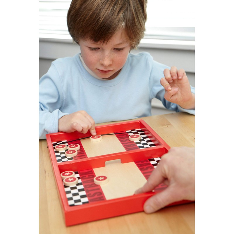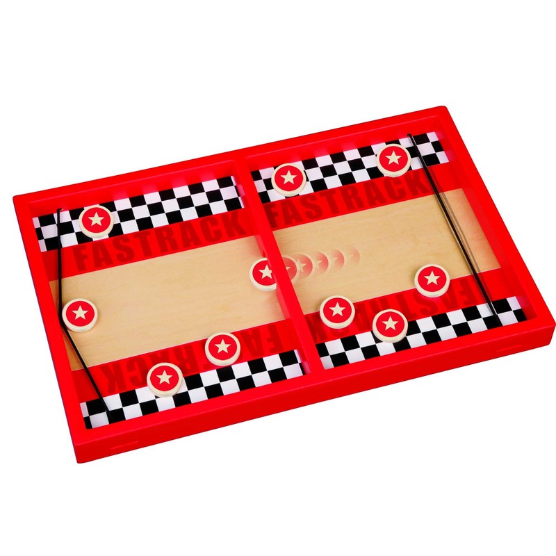 Fastrack is a high speed disc-flinging game powered by your finger! Use the elastic band to fire all of the discs through the tiny slot to the other side of the track. Aim carefully but act fast or you’ll be bombarded by your opponent’s zooming discs. Ride the fine line between speed and accuracy to win! Includes wooden track, 10 wooden discs and a drawstring pouch.