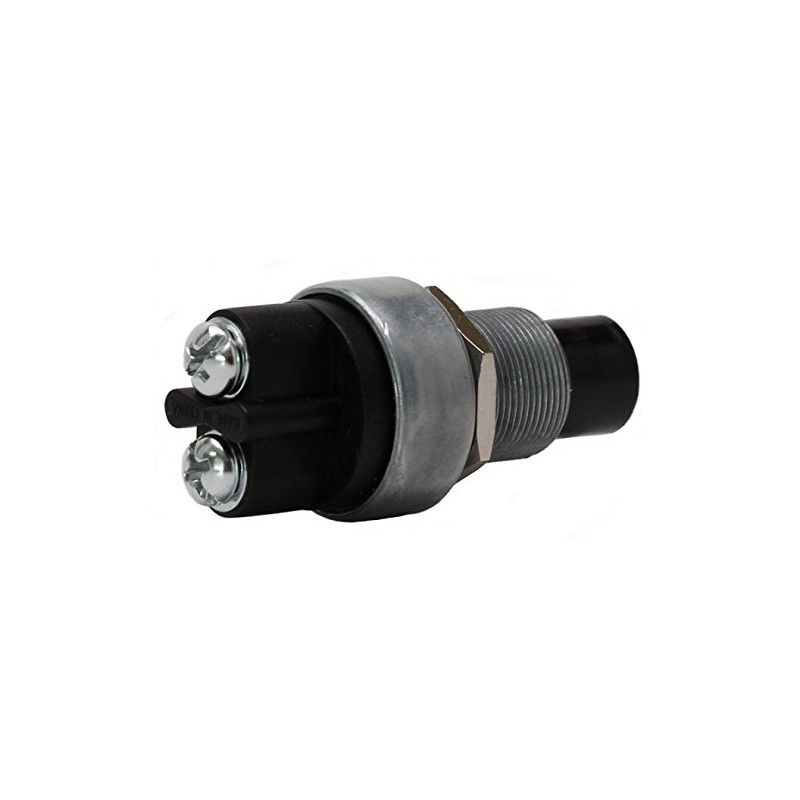 Heavy duty momentary push button switch with safety bezel to prevent incidental switch actuation. Flush terminal screws. 5/8" diameter mounting stem. Silver contacts rated at 60 Amps at 12 Volts.