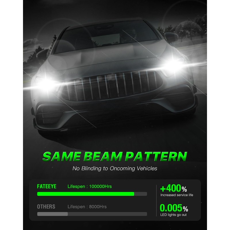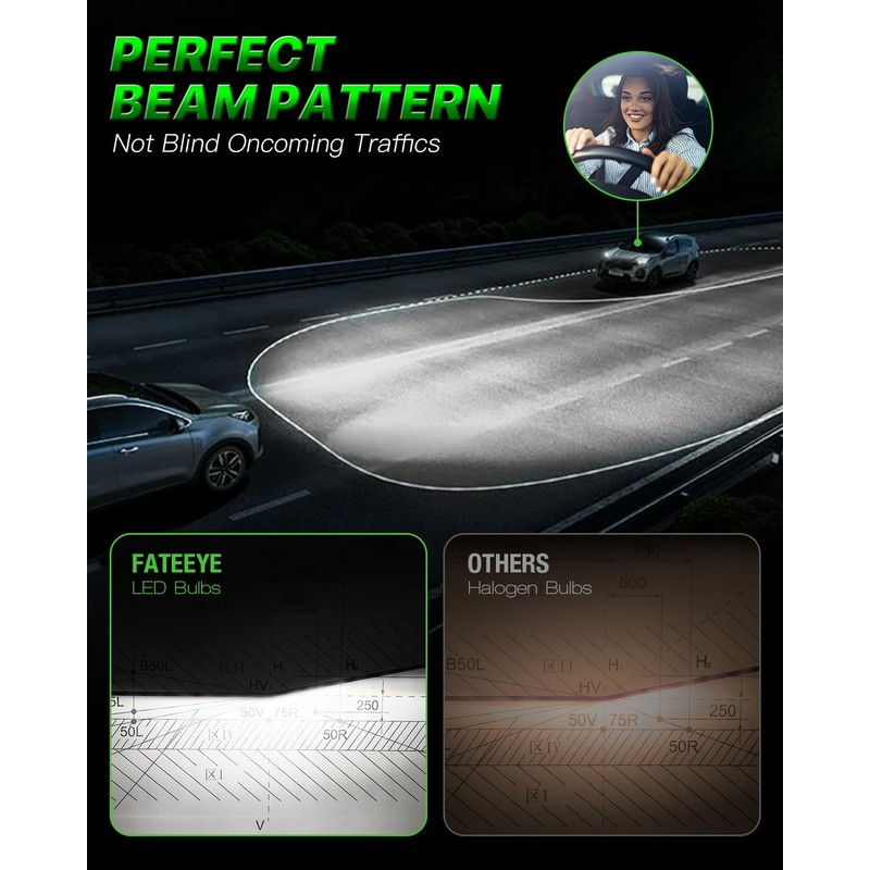 • 【Super Brightness】FateEye H7 bulb adopts the most advanced bulb chip in the market, the power can reach up to 200W, which can emit 90,000 lumens, 6500K cold white light.