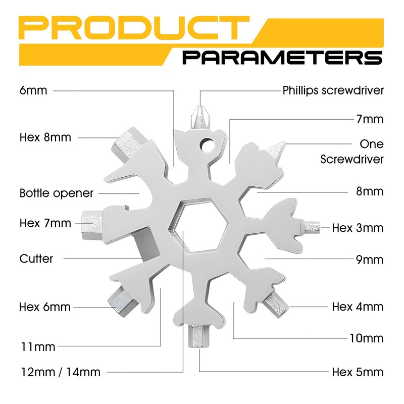 - 18-in-1 Snowflake Multitool: Our snowflake tool features incredible 18 tools that can be used as Outer Hex Wrench( 6mm-14mm), Hex( 3mm-8mm), Slotted Screwdriver, driver, Box Opener, Bottle Opener.