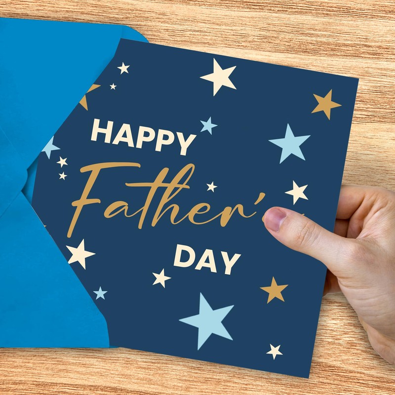 - This Father's Day, show your dad just how much he means to you with this stunning greeting card. Measuring 145mm x 145mm, this card is printed on high-quality 300gsm card stock to ensure that it looks and feels premium. The card features a classic and timeless design that is perfect for any dad.