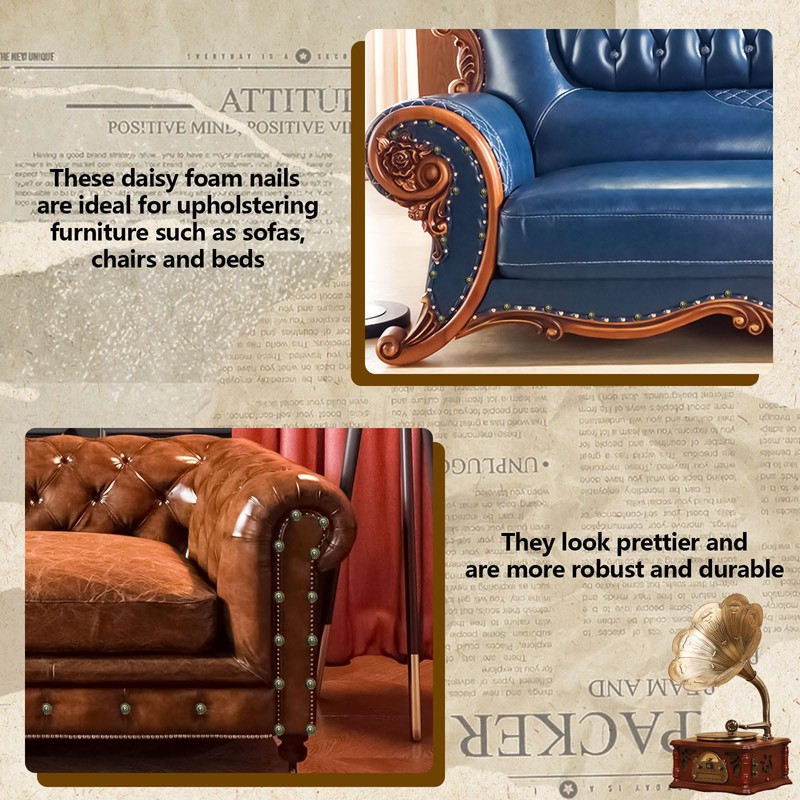 - Authentic Vintage Design: Our upholstery nails for furniture feature a charming daisy shape that adds a touch of vintage elegance to your furniture. Give your upholstery a classic and timeless look with these decorative nails.