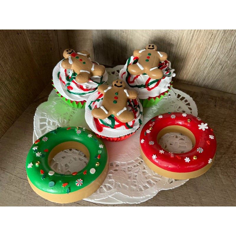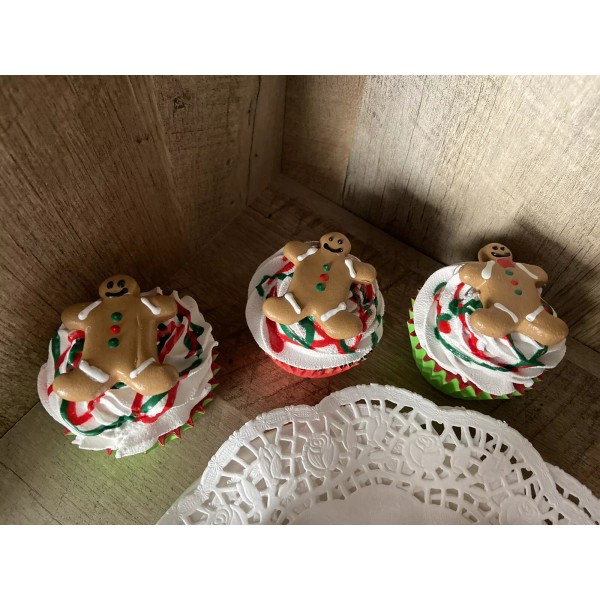 This one is frosted with white icing with green and red swirls through white frosting then topped with a cute decorated gingerbread boy! It comes in a green or red cupcake wrapper and will make an adorable holiday decoration that you can use year after year.