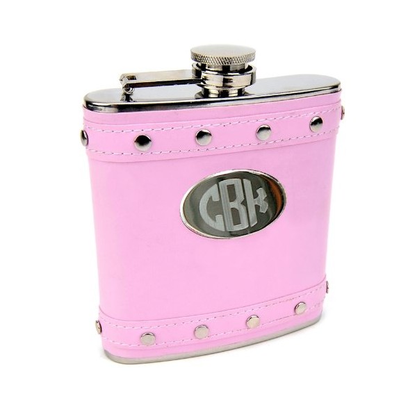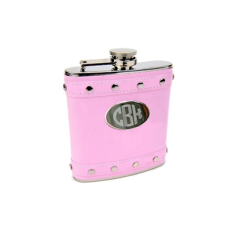 - This pink finish flask has a small metal center that's great for personalized engraving.
