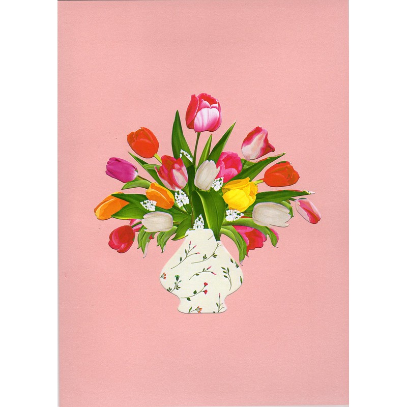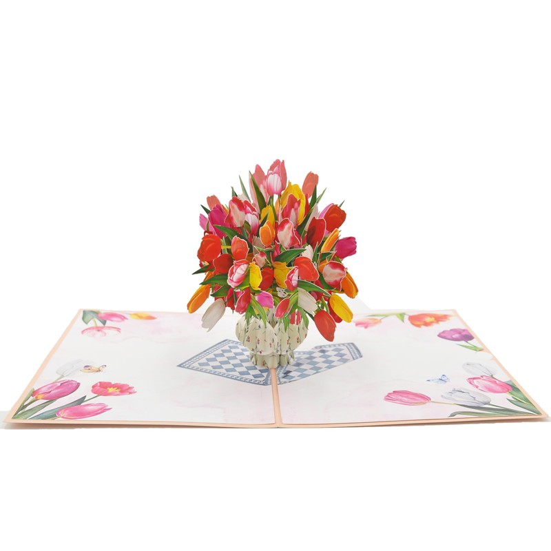 - GREAT 3D DESIGN This pop up greeting card unfolds an elegant bunch of tulips in a vase that impressively presents your greetings and serves as a decorative element.