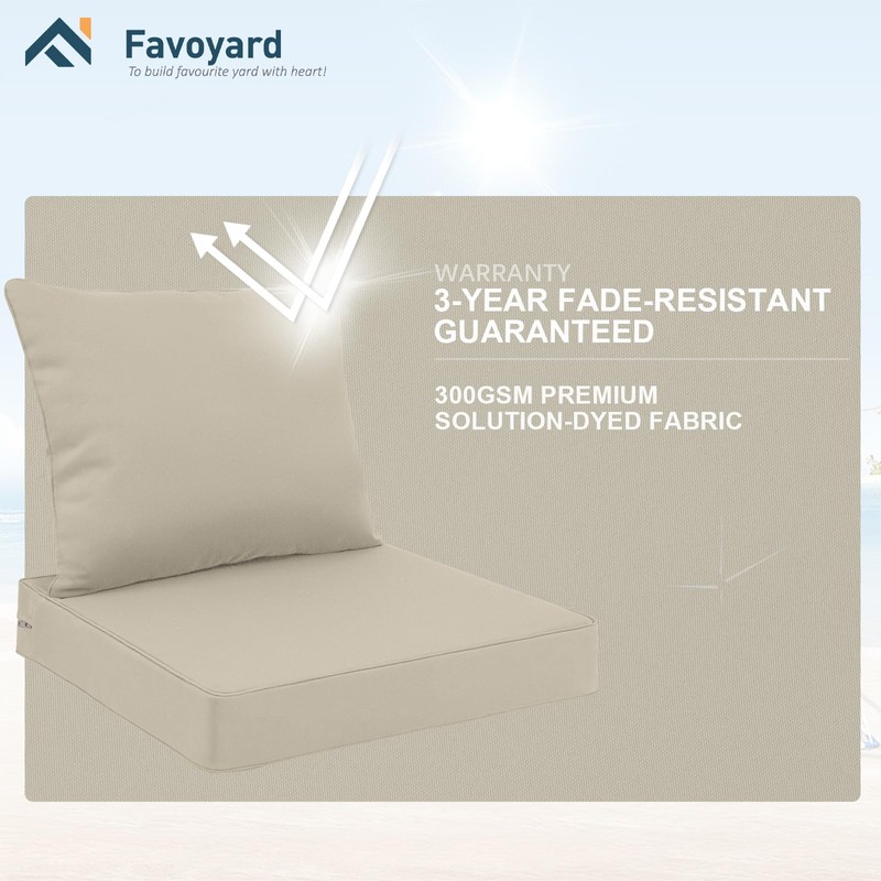 - 3-Year Fade Resistance Fabric: Our Favoyard outdoor chair cushions is made of solution-dyed fabric. This kind of fabric usually used with outdoor circumstance because of it's color fastness. With the help of the fabric our patio furniture cushion could last 3 years color fastness. And we are confident our cushions could withstand at least 1500h intense midday sunlight.