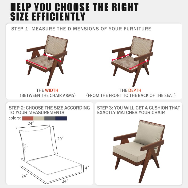 - Size Selection Guidance and Warranty: Set includes 1 seat cushion measuring 24” W x 24” D x 4” T and 1 back cushion measuring 24” W x 20” H. Measuring the dimensions of your furniture before purchasing is a really effective way to choose the right size cushions for your furniture. All the Favoyard cushions come with 1 year warranty to make sure you can choose with no worry.