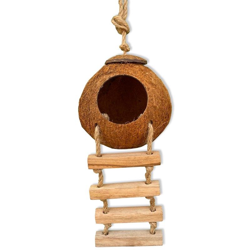 - Included Components -- 1 x Small Reptile Untreated Coconut Hut with Ladder, 1 x Sticky Wall Hook (For Glass Terrarium Lid), 1 x Carabiner Hook (For Mesh Wire Terrarium Lid or Outdoor Space). Each coco hut from Favozio comes with a 4” length of rope so that it can conveniently be tied to the top of your pet’s house and securely dangle down.