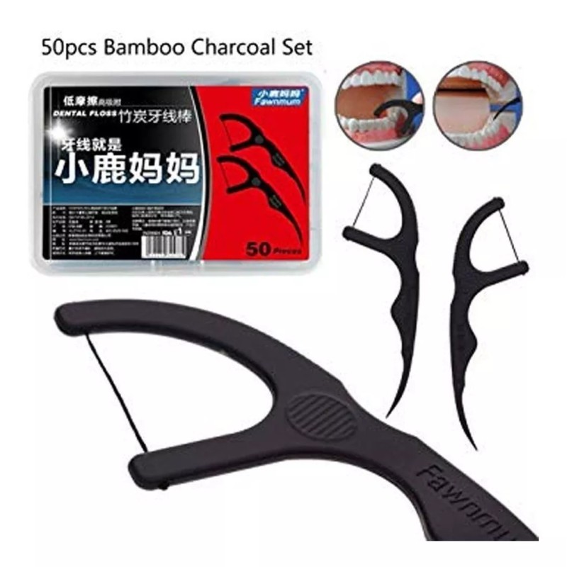 Hilo dental con palillo y Hilo de carbón de bambú.