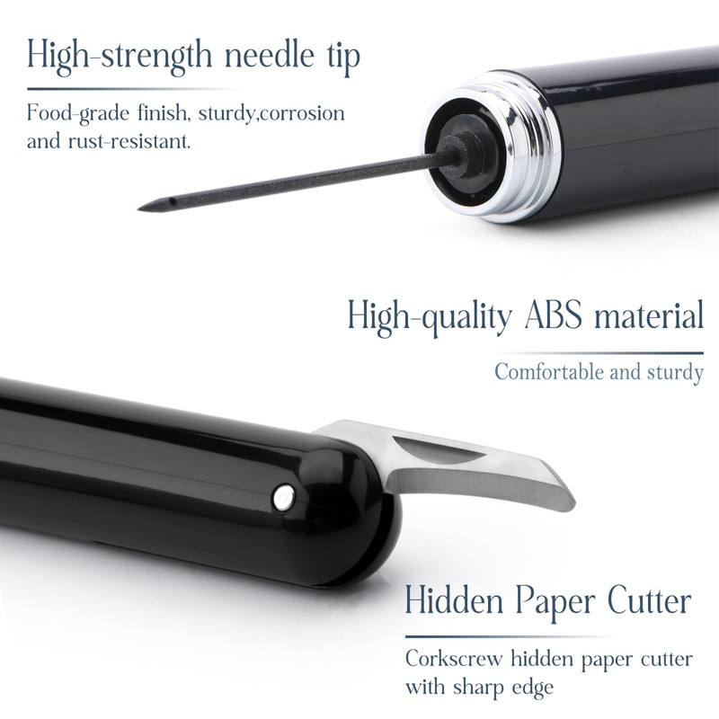 - 2-in-1 air pressure wine opener: The product includes 2 wine bottle opener. The air pump wine bottle opener build-in a foil cutter to removes the foil top from your wine bottle effortlessly. The needle can be covered with a pen cap after use, to prevent accidental injury.