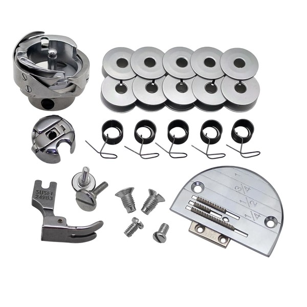- Including :Bobbin Case ; Rotary Hook;Wide Hinged Foot;Needle Plate;Feed Dog;2PCS Feed Dog Screws;2PCS Needle Plate Screws;2PCS Thumb Screws;5PCS Check Spring; 10PCS Aluminum Bobbins