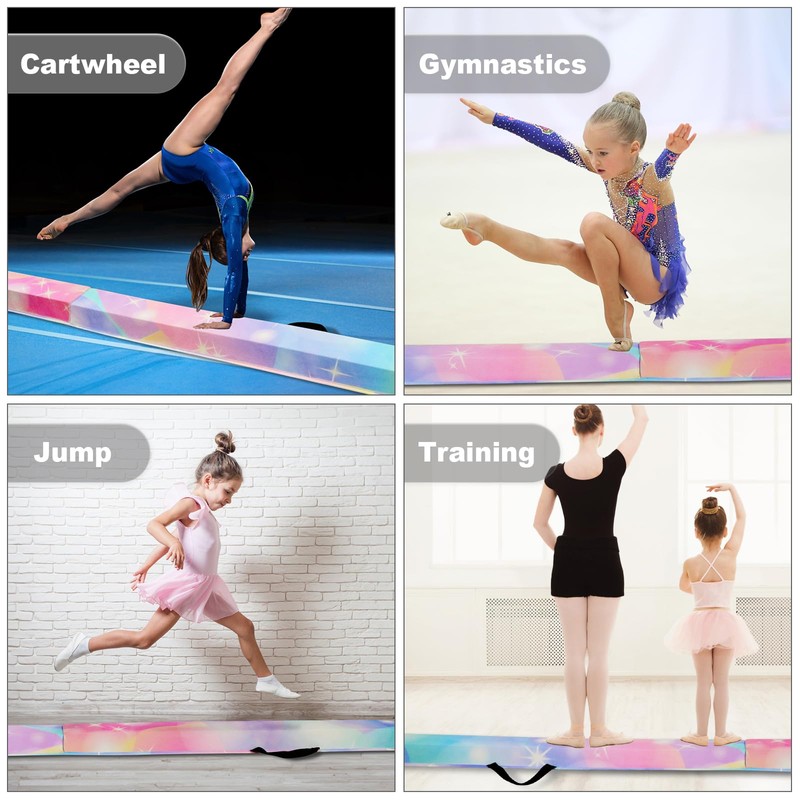 - WIDE APPLICATION: 9.5FT long with a 4 in balancing surface our junior gymnastics pad is a high quality low beam for girls looking to practice moves such as handspring, cartwheel, handstand, leap, jumps, walkovers, and kicks. This is a great gymnastics equipment for home.