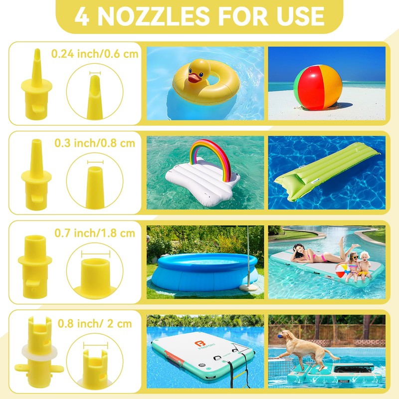 - All in One Set: Come with 4 different sizes of nozzles and a hose, suitable for a wide range of inflatable products, fast inflation saves time and energy so you can enjoy more fun.