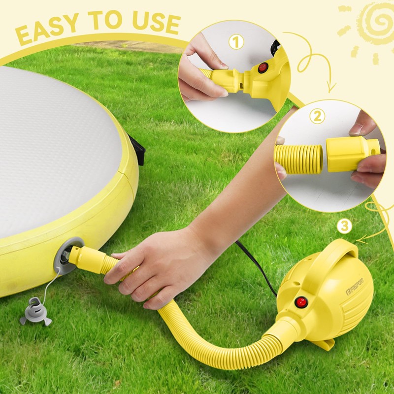 FBSPORT Air Pump for Inflatable Mat Yellow, Electric Air Pump 600W with 4 Nozzles, Portable and Fast Inflation AC110-120V, Suitable for Air Mat Float Dock Inflatable Beds