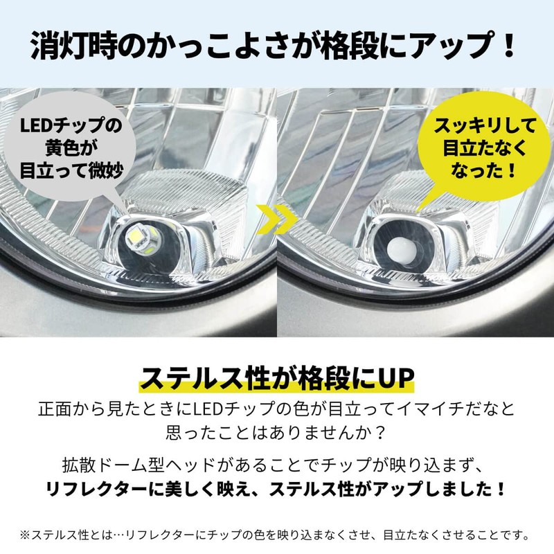 - Feature 1: Illuminates all directions with no uneven light: The LED features a straight light with a high performance diffusion dome head for a wide illumination range of 360°. It also achieves uniform brightness with no unevenness. Feature 2: Greatly improved when the light is off: Have you ever thought the color of the LED chips stand out from the front and it was impossible to use? The diffused dome head prevents the tip from showing off and makes it look beautiful on the reflector and improves stealth. Feature 3: Long Life: Reduces the load on the LED bulb for a long life. Designed to reduce the load on the LED bulbs, and heat-resistant materials that are not affected by high heat emission such as HIDs, so you can use it for a long time with peace of mind. By adopting high quality LED chips, it reduces the amount of heat and reduces the risk of failure of parts with fewer parts. 3. Adopts constant current circuit to provide constant current even when voltage fluctuations, reducing the load on the LED. The heat resistant plastic material allows you to stay lit at all times or when the temperature inside the light unit rises up