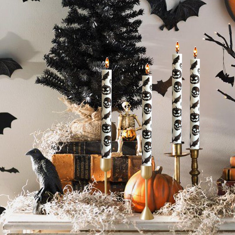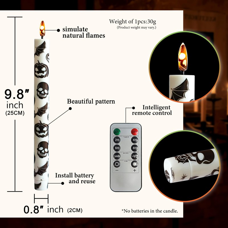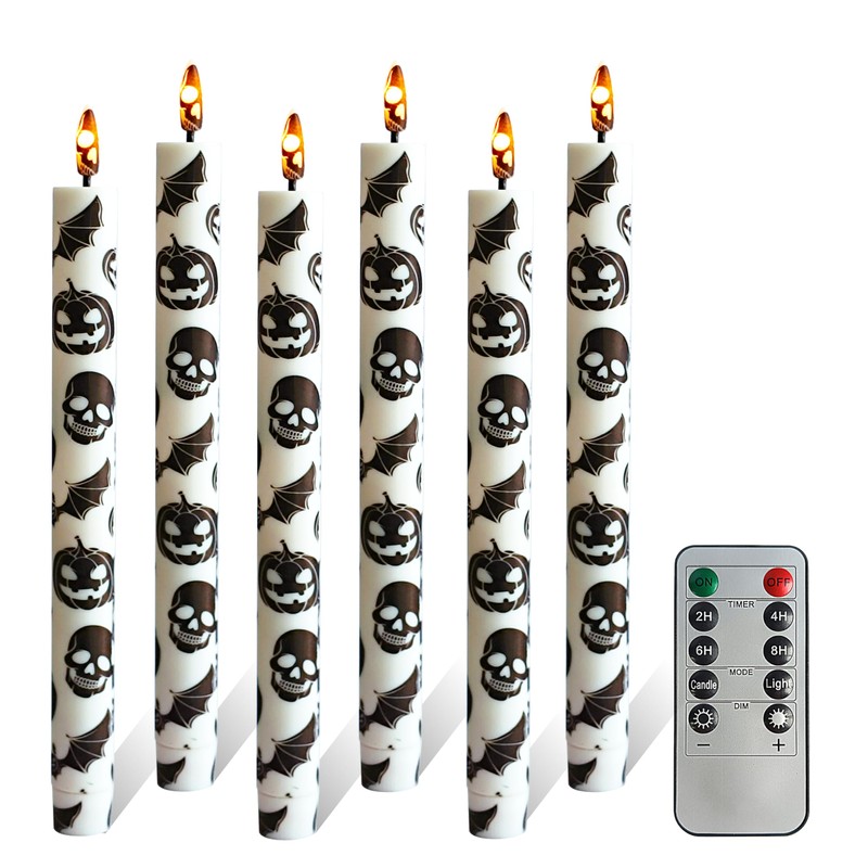 FCMSHAMD 6PCS Halloween Pumpkin Bat Flameless Taper Candles, 9.5 Inch LED Candlesticks Battery Operated with 11-Key Remote and Timer, 3D Flickering Flame Lights for Halloween Party Home Decor Gifts