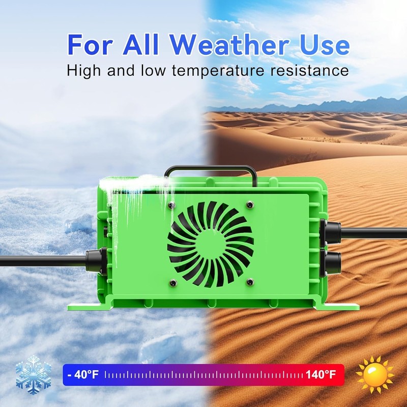 - 【IP67 Waterproof & Exceptional Durability】This 48 volt Lead-Acid charger is constructed with fully sealed aluminum die-cast casing, meanwhile the inside circuit board is filled with glue, it feautres an IP67 waterproof rating, avoid dust, moisture, water, heat conduction and flame retardant. Our battery charger comes with a cooling fan can adjust speed automatically according to inner temperature,which greatly increases the cooling efficiency