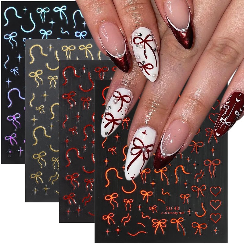 - 【You will get】There is 4 sheets 3D self-adhesive bow stickers for nail art,including colors of laser gold,holographic pink,glitter red and laser red.