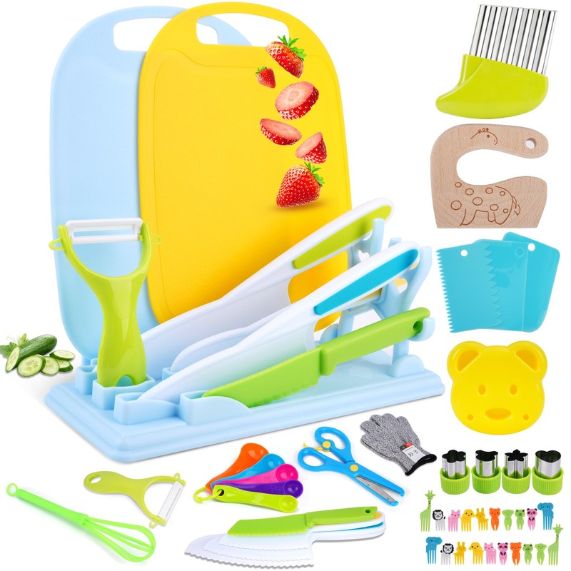 - 【24 Pcs Complete & Safe Toddler Knife Set】FCSONU montessori upgrade toddler kitchen playset includes: 1 knife holder set with 4 serrated edges plastic knives, 1 peeler and 2 cutting boards; 1 wooden knife, 5 sandwich cutter (1 bear head, 4 cookie cutters); 1 crinkle cutter, 3 cake scrapers, 1 safety scissors, 1 egg beater, 1 set measuring spoon, 1 set kitchen gloves, 2 set fruit fork. A variety of styles and uses of montessori kitchen set can meet the needs of kids kitchen usage requirements