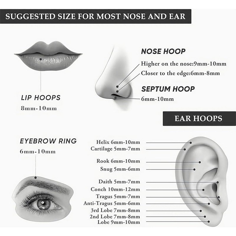• Multiple use: suitable for different piercing needs such as navel piercing, tongue piercing, nose ring, septum piercing, laboratory studs, lip piercing, monero, cartilage, tragus piercing, etc.