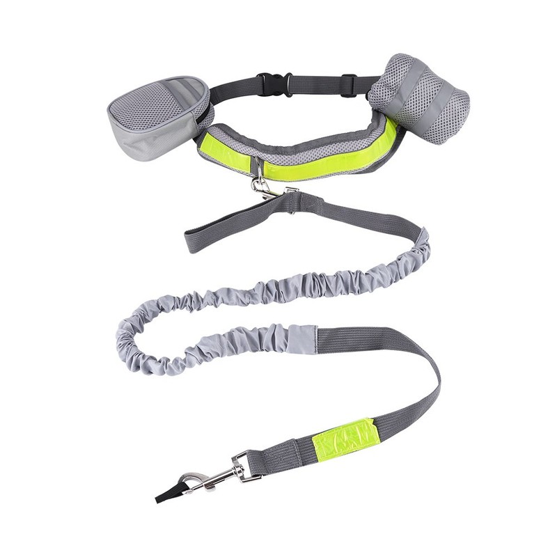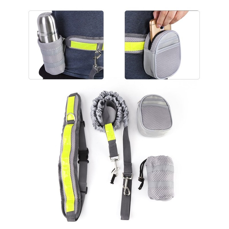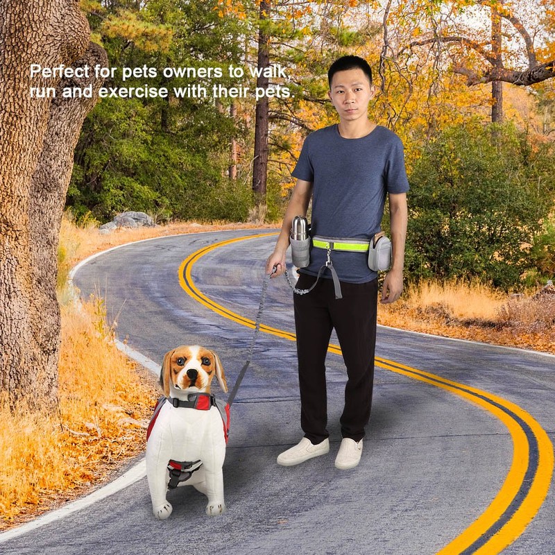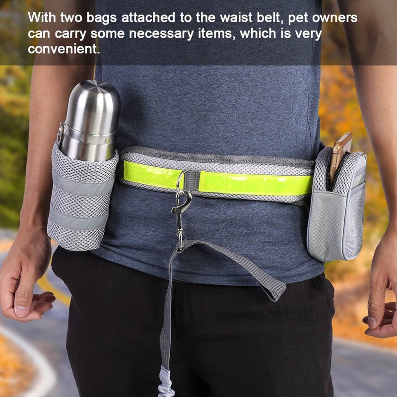 This pet leash set is a product for pet owners to walk, run and exercise with their pets, and more importantly, it can pet owners' hands to do other things while they are having a good time with their pets. With two bags attached to the waist belt, pet owners can carry some necessary items, which is very convenient. Besides, made of reflective material, it is even suitable for night exercise.