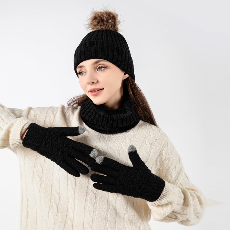 fdsmall 3 in1 Winter Hat Scarf Gloves Set, Winter Warm Elastic Knitted Beanie Hat, Circle Neck Warmer Scarf and Touch Screen Gloves Set, Outdoor Sports Soft Fleece Inner Lining Gift (Black)