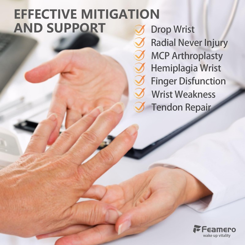 - Innovative Tension Adjustment Knob: FEAMERO Radial Nerve Palsy Splint features an innovative tension adjustment knob, allowing you to personalize the level of support for enhanced finger extension and wrist stability. Designed in collaboration with professional therapists, it effectively addresses symptoms like wrist droop, limited finger movement, radial nerve injury, MCP arthroplasty, hemiplegic wrist, finger dysfunction, wrist weakness, and tendon repair, ensuring the splint adapts to your unique recovery needs.