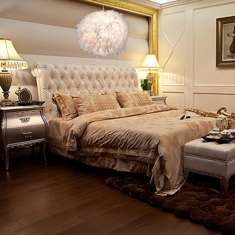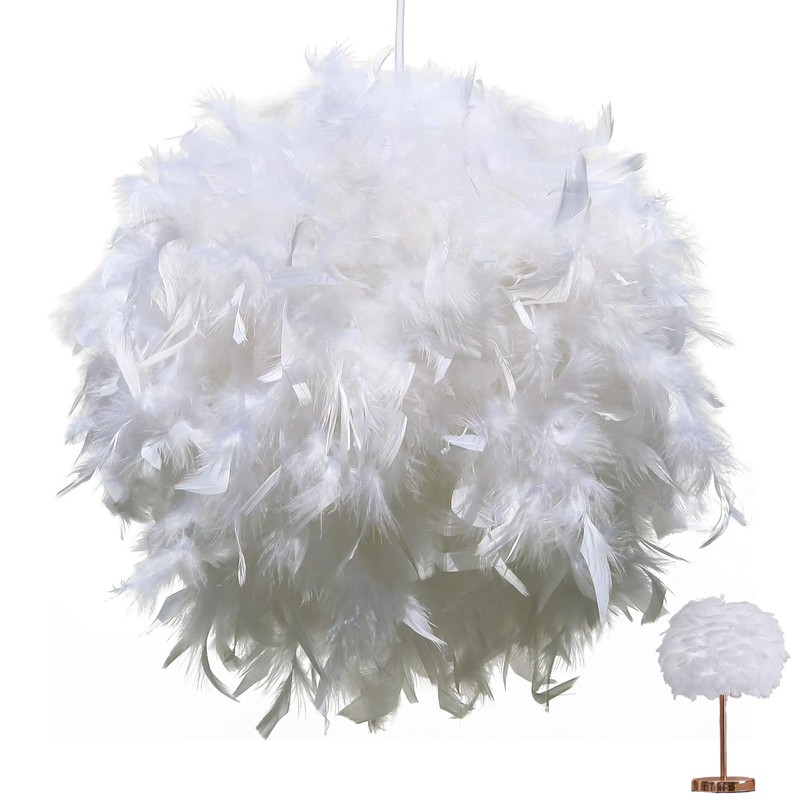 - Dimensions: Outer diameter (from feathers) 30cm, inner diameter 20cm & height 20cm. The fluffy bedroom light shades can be hanged onto existing light fitting. Its unique design allows option for up and down lighting. Feather lampshade can be used as a perfect decoration for homes, restaurants and cafes.
