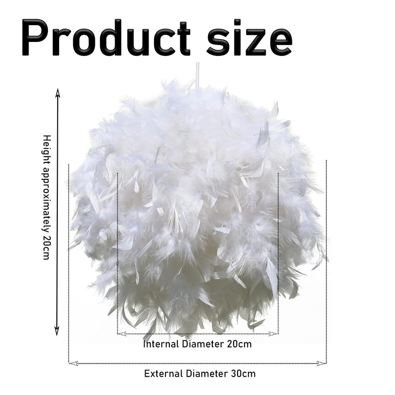 - Dimensions: Outer diameter (from feathers) 30cm, inner diameter 20cm & height 20cm. The fluffy bedroom light shades can be hanged onto existing light fitting. Its unique design allows option for up and down lighting. Feather lampshade can be used as a perfect decoration for homes, restaurants and cafes.