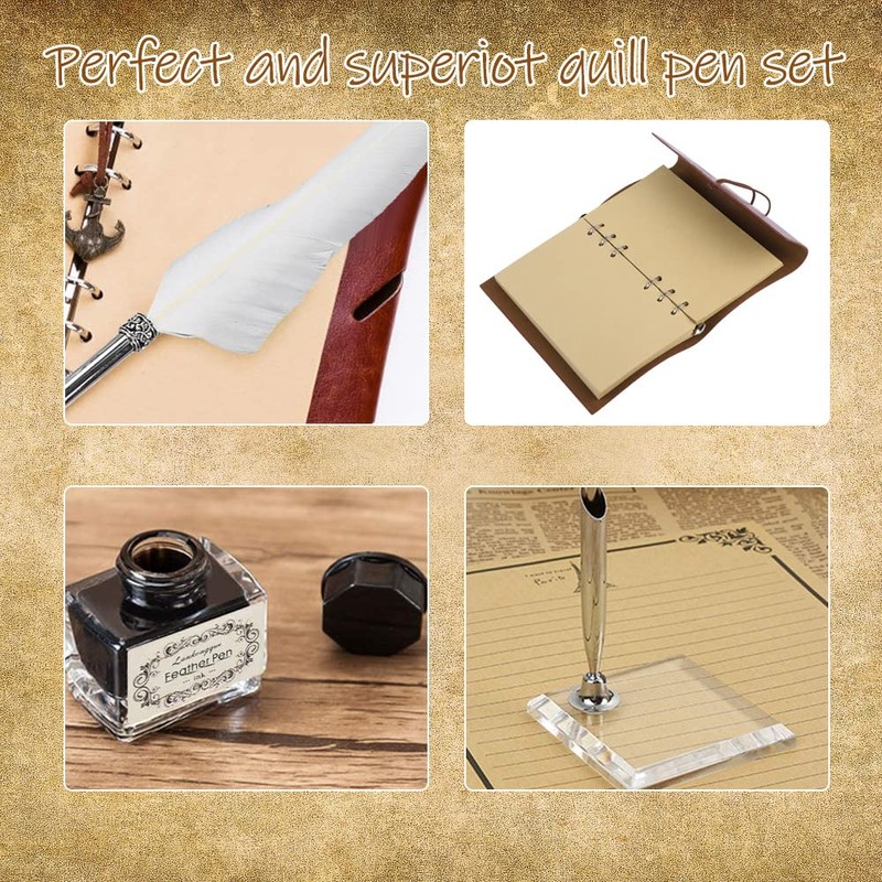 Feather Quill Pen Set, Retro Leather Notebook Feather Dip Pen Ink Bottle Set, Stationery Gift Box, with 1 Feather Dip Pen, 1 Notebook, 1 Pen Tip Base, 1 Ink Bottle (without Ink) (White)
